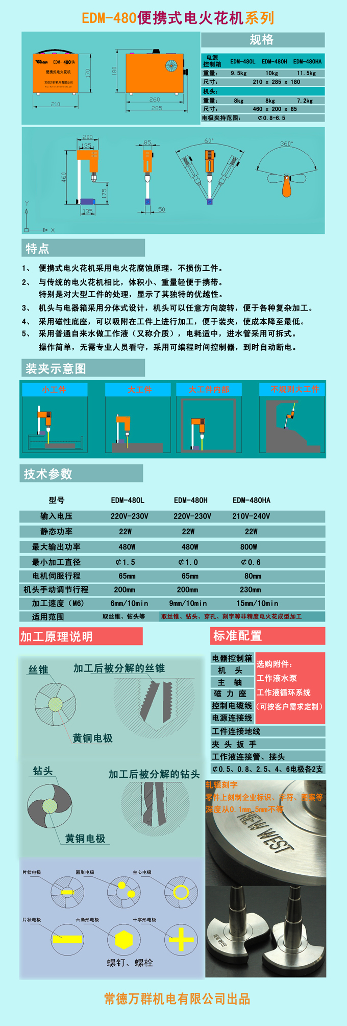 EDM-480HAEDM-480系列產品的終極典范,亦是目前EDM-480系列產品的巔峰代表,是目前市場中客戶占有量最多的機型,北京大學地球與空間科學學院采用此款機器成功加工直徑0.08的微孔,速度高于美國同類產品的5EDM-480H相比加工速度更快,自適應電壓范圍寬,加工過程中市電的不穩定對加工速度的影響極為微小,整個機器在工作過程中確保精密、穩定的放電加工。同時支持了普通電火花成型機床的電腐蝕加工,體現于能在金屬零件表面刻制圖案、字符等非精度要求的電火花加工。適合于斷絲錐、鉆頭、鉸螺釘等,大型工件,或超大型工件的用戶。軋輥刻字,商標蝕刻,硬質合金成型加工等企業用戶。